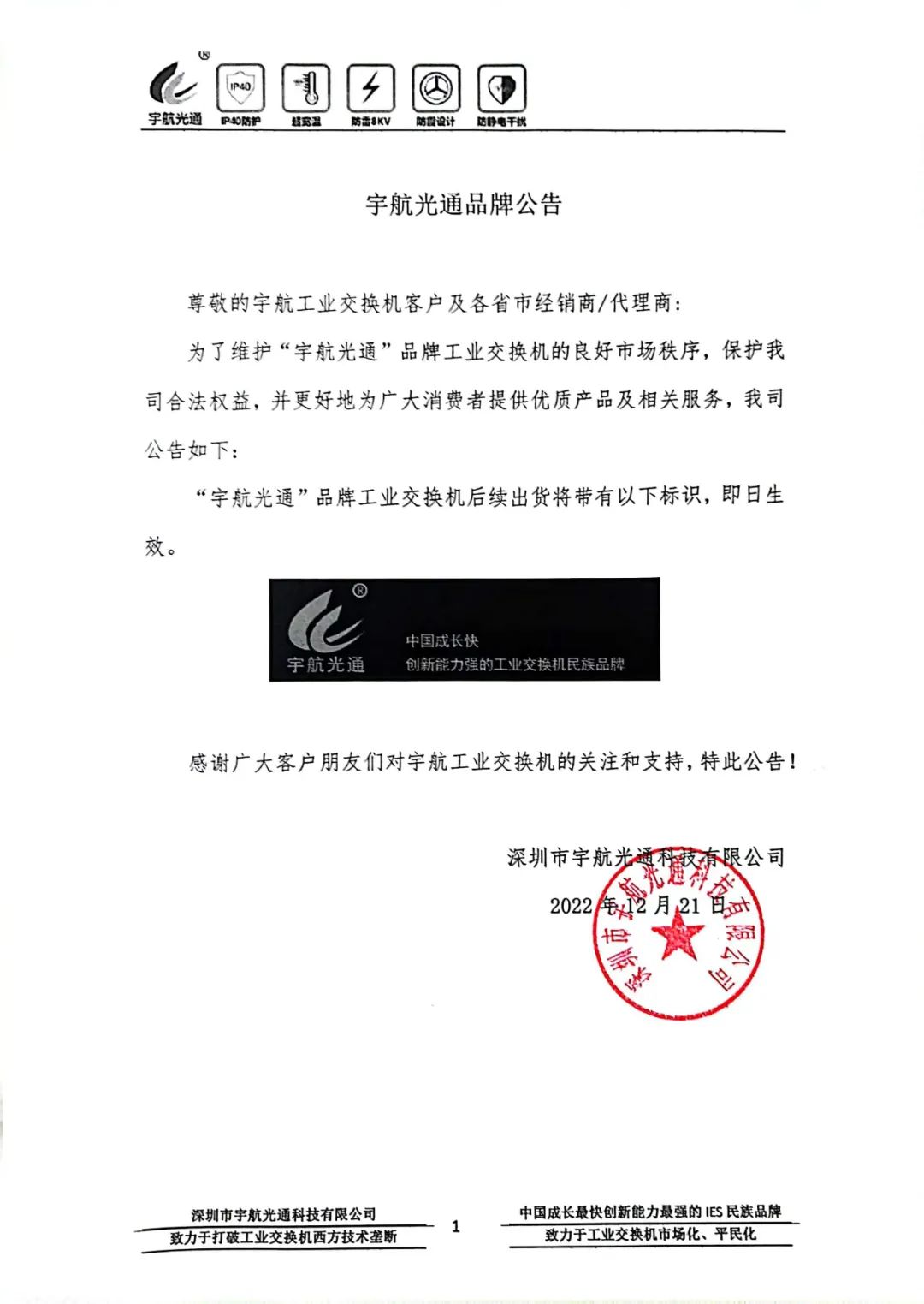 宇航工業交換機發布關于宇航光通品牌公告!