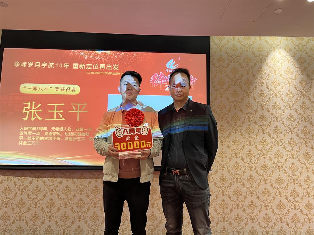 張玉平—入職宇航八周年獎,獎勵現金三萬元。張玉平作為公司的元老級人物,不僅業績一流,而且形象氣質更是一流,高大帥氣,走路帶風,說話詼諧幽默,做事一絲不茍。
