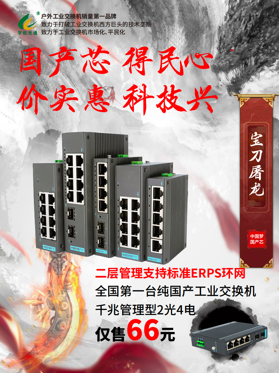 宇航作為中國企業的一份子,同時作為工業交換機戶外市場銷量第一的民族企業,我們在黨的領導下,瞄準未來方向,堅定不移走好中國路。我們國人相信,緊扣發展脈搏,久久為功打造“中國芯”,我們就一定能突破壁壘沖破封鎖,也必將讓中國科技中國芯在不久的將來,在全球舞臺上展現耀眼的光芒。宇航工業交換機將和我們國人一起高舉:拳拳巨子中國芯,共筑復興中國夢。 在安博會之際,宇航作為戶外銷量第一品牌工業級交換機生產廠商,上市推出全國產管理型千兆2光4電管理型工業級交換機,價格僅售66元。
