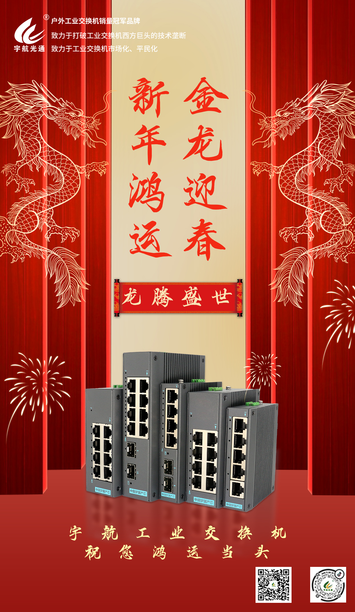 新年伊始,萬(wàn)象更新,2024愿大家在前行的道路上,滿(mǎn)懷對(duì)未來(lái)的熱忱與期待,如陽(yáng)光般明媚,如春風(fēng)般自由,愿每個(gè)人都能實(shí)現(xiàn)自己的夢(mèng)想。宇航工業(yè)交換機(jī)全體員工祝福大家新年快樂(lè)、心想事成、萬(wàn)事如意、闔家幸福!