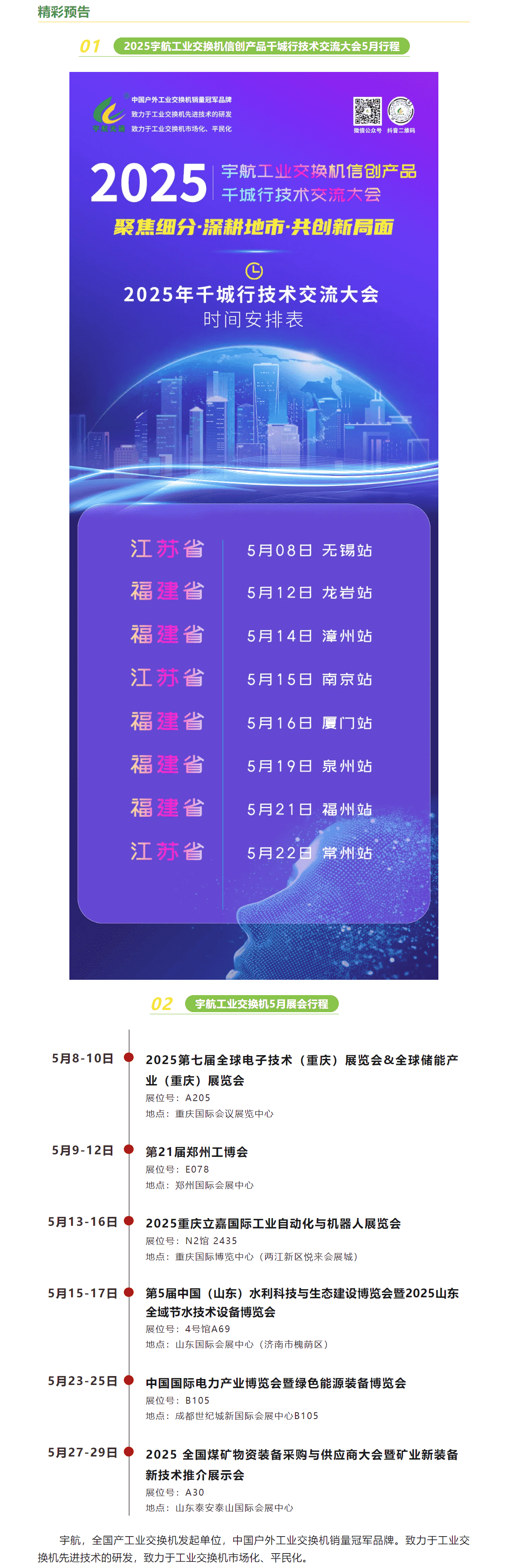 一夜熏風吹春去,萬物并秀迎夏來。2025宇航工業交換機信創產品干城行技術交流大會5月份將分別在浙江、福建、江蘇等省份盛大舉辦,具體涵蓋了8個地市。另外,5月份宇航工業交換機將亮相重慶儲能展、鄭州工博會、重慶自動化展、山東水展、四川電力展以及全國煤礦展等各大展會,期待您的蒞臨!