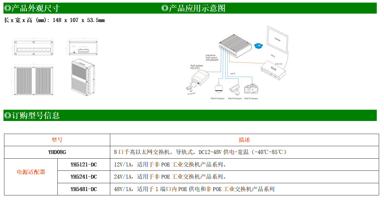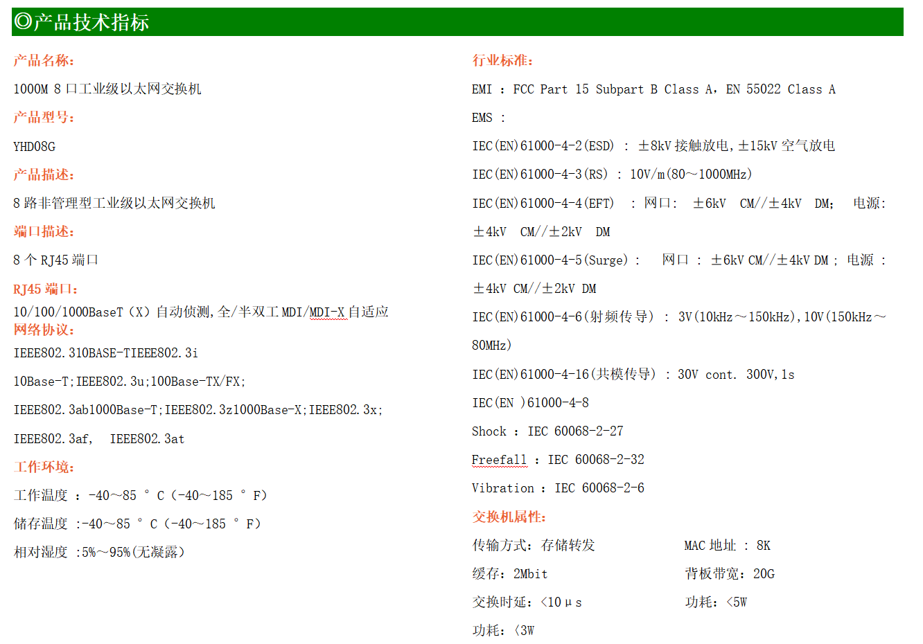 8路千兆電口工業級以太網交換機,支持8個10Base-T/100Base-T/1000Base-TX電口。產品符合FCC、CE、ROHS標準。YHD08G交換機具有-40℃~85℃的工作溫度,具有超強的堅固度能適應各種嚴苛環境,也可以非常方便的安置在空間緊湊的控制箱中。導軌的安裝特性、寬溫操作及擁有IP40防護等級的外殼及LED指示燈,使YHD08G成為一個即插即用的工業級設備,為用戶的以太網設備聯網提供可靠、便捷的解決方案。