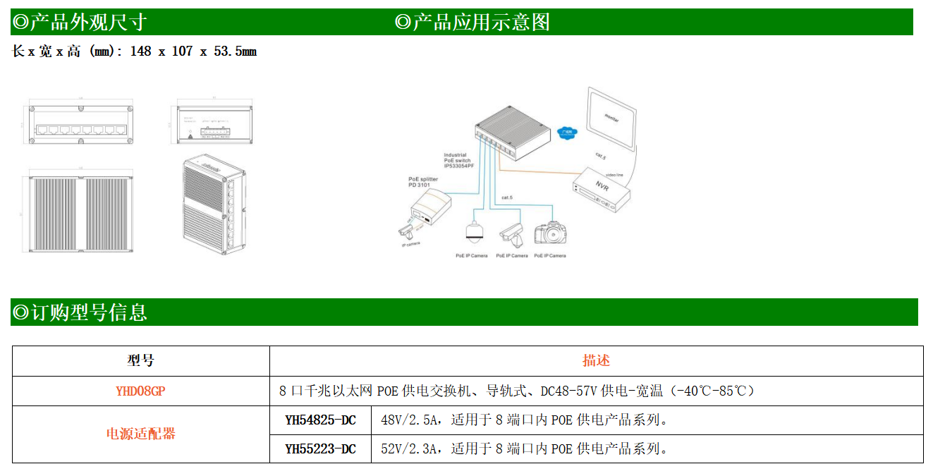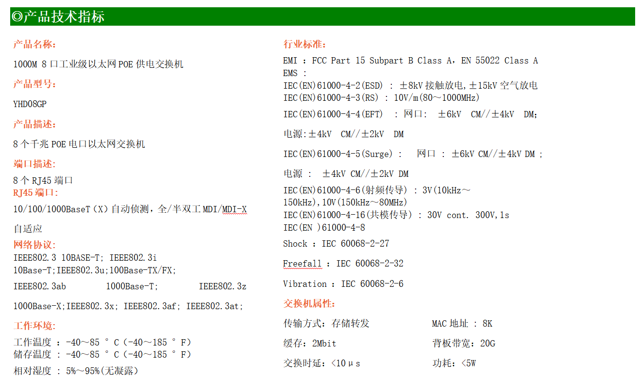8路千兆電口工業(yè)級(jí)以太網(wǎng)交換機(jī),支持8個(gè)10Base-T/100Base-TX POE電口。產(chǎn)品符合FCC、CE、ROHS標(biāo)準(zhǔn)。YH300-08FP交換機(jī)具有-40℃~85℃的工作溫度,具有超強(qiáng)的堅(jiān)固度能適應(yīng)各種嚴(yán)苛環(huán)境,也可以非常方便的安置在空間緊湊的控制箱中。導(dǎo)軌的安裝特性、寬溫操作及擁有IP40防護(hù)等級(jí)的外殼及LED指示燈,使YH300-08FP成為一個(gè)即插即用的工業(yè)級(jí)設(shè)備,為用戶(hù)的以太網(wǎng)設(shè)備聯(lián)網(wǎng)提供可靠、便捷的解決方案。