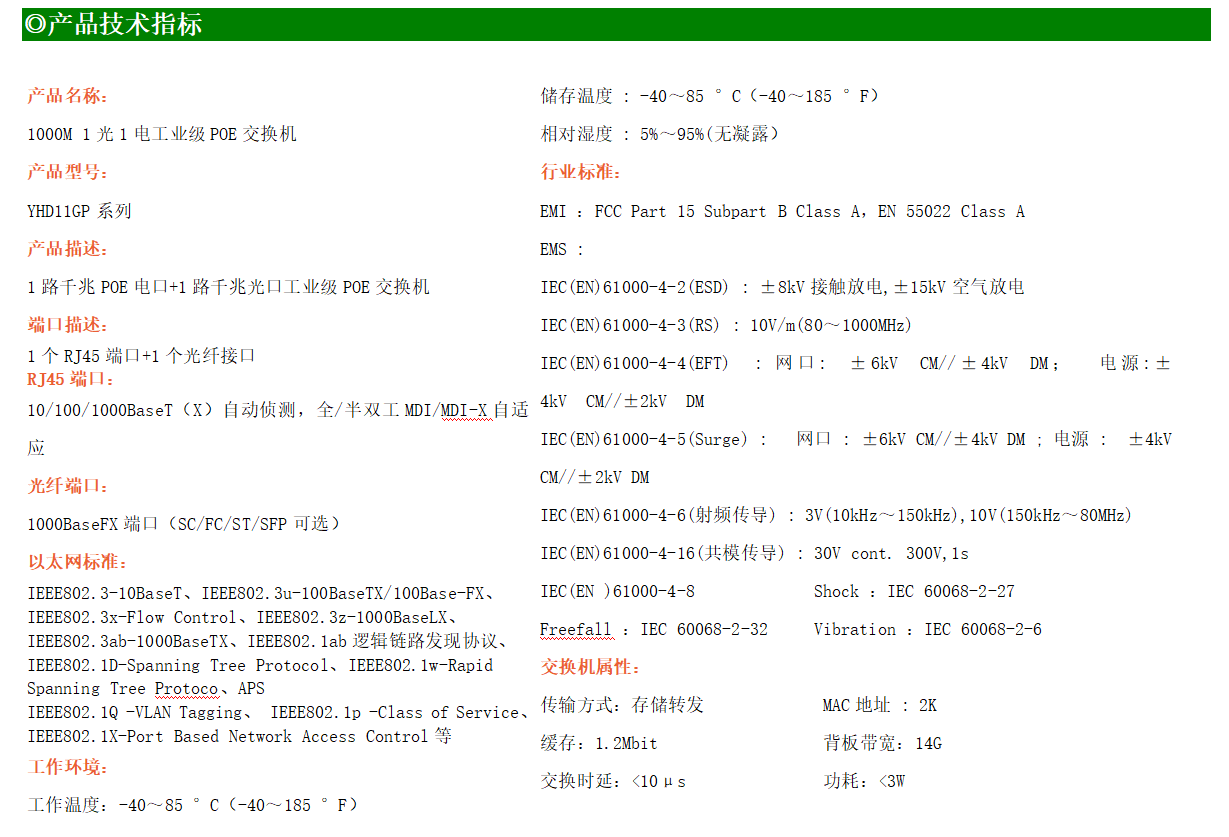 1路千兆POE電口+1路千兆FX光口工業級以太網POE交換機,支持1個10/100Base-TX電口和1個100Base-X光口。產品符合FCC、CE、ROHS標準。YH300-11GP系列交換機具有-40℃~85℃的工作溫度,具有超強的堅固度能適應各種嚴苛環境,也可以非常方便的安置在空間緊湊的控制箱中。導軌的安裝特性、寬溫操作及擁有IP40防護等級的外殼及LED指示燈,使YH300-11GP成為一個即插即用的工業級設備,為用戶的以太網設備聯網提供可靠、便捷的解決方案。