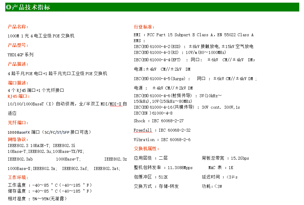 4路千兆POE電口+1路千兆FX光口工業級以太網POE交換機,支持4個10/100/1000Base-TX電口和1個1000Base-X光口。產品符合FCC、CE、ROHS標準。YH300-14GP系列交換機具有-40℃~85℃的工作溫度,具有超強的堅固度能適應各種嚴苛環境,也可以非常方便的安置在空間緊湊的控制箱中。導軌的安裝特性、寬溫操作及擁有IP40防護等級的外殼及LED指示燈,使YH300-14GP成為一個即插即用的工業級設備,為用戶的以太網設備聯網提供可靠、便捷的解決方案。