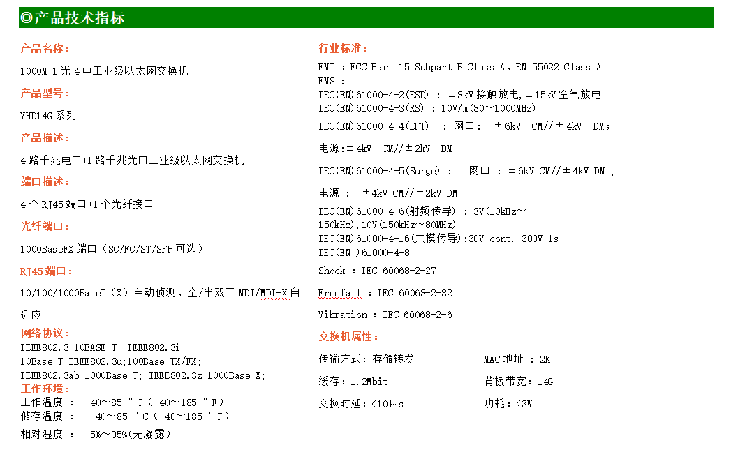 4路千兆電口+1路千兆FX光口工業(yè)級(jí)以太網(wǎng)交換機(jī),支持4個(gè)100Base-T/1000Base-TX電口和1個(gè)1000Base-X光口。產(chǎn)品符合FCC、CE、ROHS標(biāo)準(zhǔn)。YH300-14G系列交換機(jī)具有-40℃~85℃的工作溫度,具有超強(qiáng)的堅(jiān)固度能適應(yīng)各種嚴(yán)苛環(huán)境,也可以非常方便的安置在空間緊湊的控制箱中。導(dǎo)軌的安裝特性、寬溫操作及擁有IP40防護(hù)等級(jí)的外殼及LED指示燈,使YH300-14G系列成為一個(gè)即插即用的工業(yè)級(jí)設(shè)備,為用戶的以太網(wǎng)設(shè)備聯(lián)網(wǎng)提供可靠、便捷的解決方案。