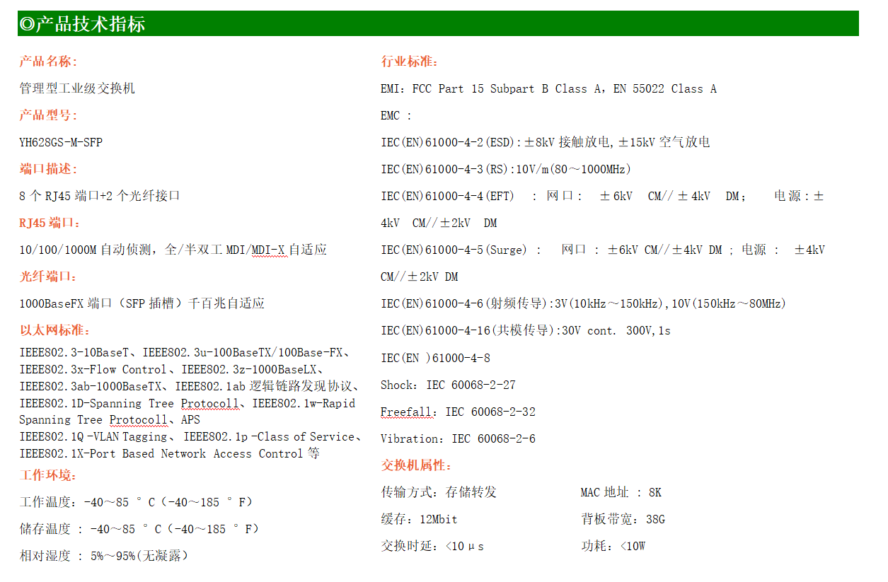 YHH600-28GS-M-SFP是網管型工業以太網交換機,產品符合FCC、CE、RoHS標準。支持2個千兆光口和8個千兆電口;支持工業現場所需的以太網二層協議,保證通信網絡的穩定性;該系列交換機采用低功耗、無風扇設計,確保無噪聲干擾,同時支持-40~85℃工作溫度和良好的EMC電磁兼容性能,保證在惡劣的工業環境中保持穩定的工作,為工廠自動化,智能交通,視頻監控等工業應用領域組建快速穩定的網絡終端接入網絡提供安全可靠的解決方案。
