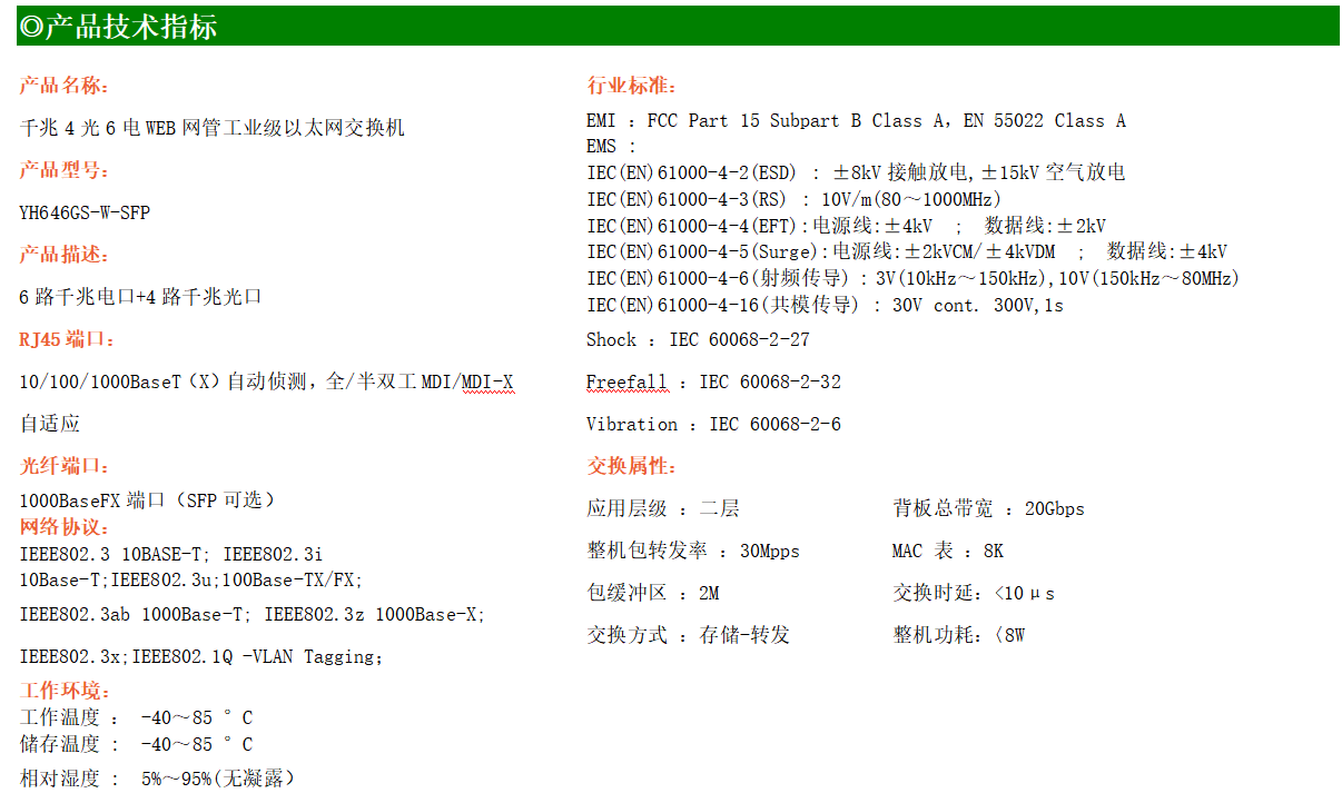 YH600-46GS-SFPWEB網管工業級以太網交換機,產品符合FCC、CE、ROHS標準,支持工業現場所需的以太網二層協議,保證通信網絡的穩定性。該系列交換機采用低功耗、無風扇設計,確保無噪聲干擾,同時支持-40~85℃工作溫度和良好的EMC電磁兼容性能,保證在惡劣的工業環境中保持穩定的工作,為工廠自動化,智能交通,視頻監控等工業應用領域組建快速穩定的網絡終端接入網絡提供安全可靠的解決方案。