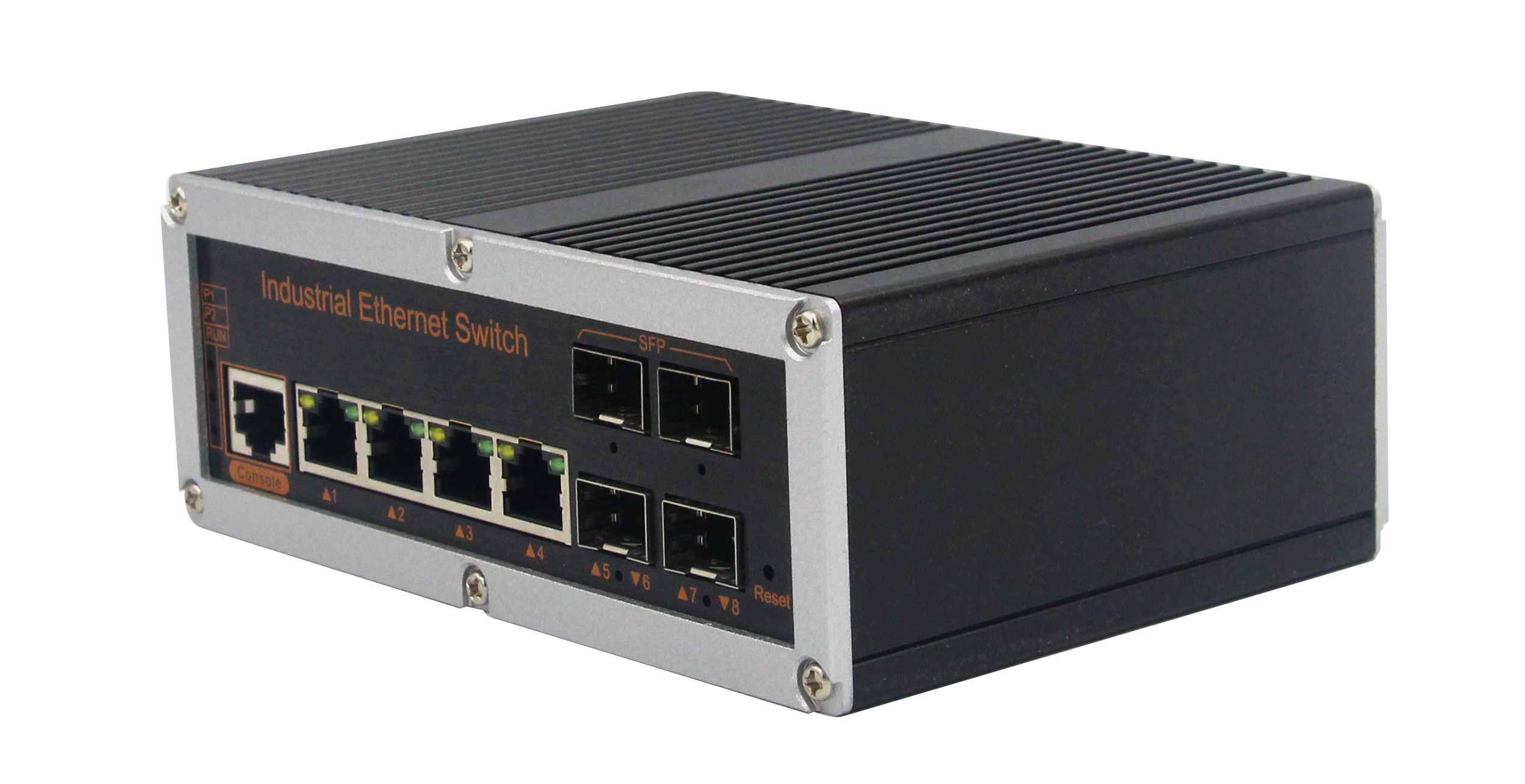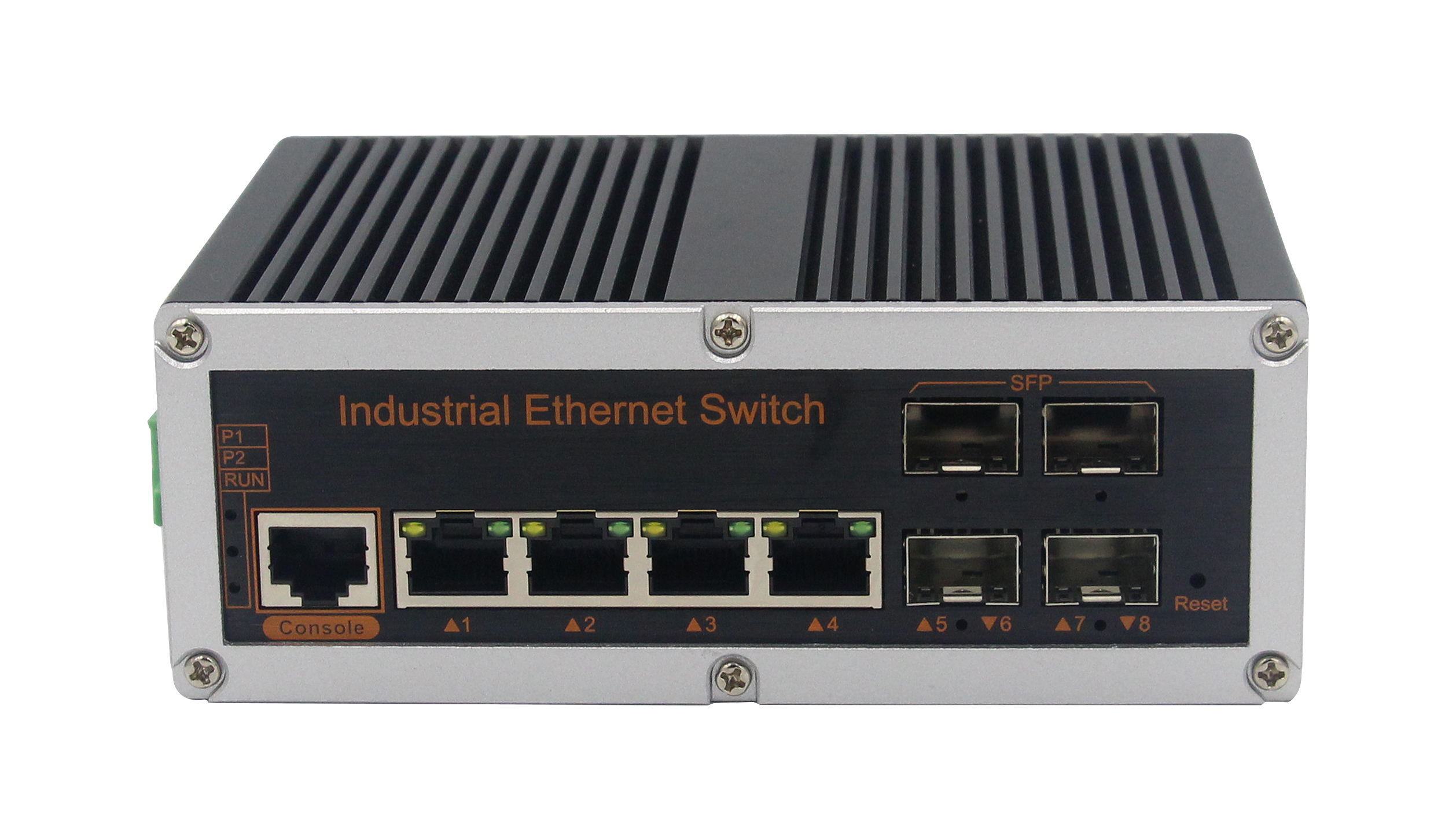 網(wǎng)管型千兆4光4電系列工業(yè)以太網(wǎng)交換機,產(chǎn)品符合FCC、CE、ROHS標準。支持4個千兆光口和4個千兆電口,支持一路console口;支持工業(yè)現(xiàn)場所需的以太網(wǎng)二層協(xié)議,保證通信網(wǎng)絡的穩(wěn)定性;該系列交換機采用低功耗、無風扇設計,確保無噪聲干擾,同時支持-40~85℃工作溫度和良好的EMC電磁兼容性能,保證在惡劣的工業(yè)環(huán)境中保持穩(wěn)定的工作,為工廠自動化,智能交通,視頻監(jiān)控等工業(yè)應用領域組建快速穩(wěn)定的網(wǎng)絡終端接入網(wǎng)絡提供安全可靠的解決方案。護等級的外殼及 LED 指示燈,使之成為一個即插即用的工業(yè)級設備,為用戶的以太網(wǎng)設備聯(lián)網(wǎng)提供可靠、便捷的解決方案。