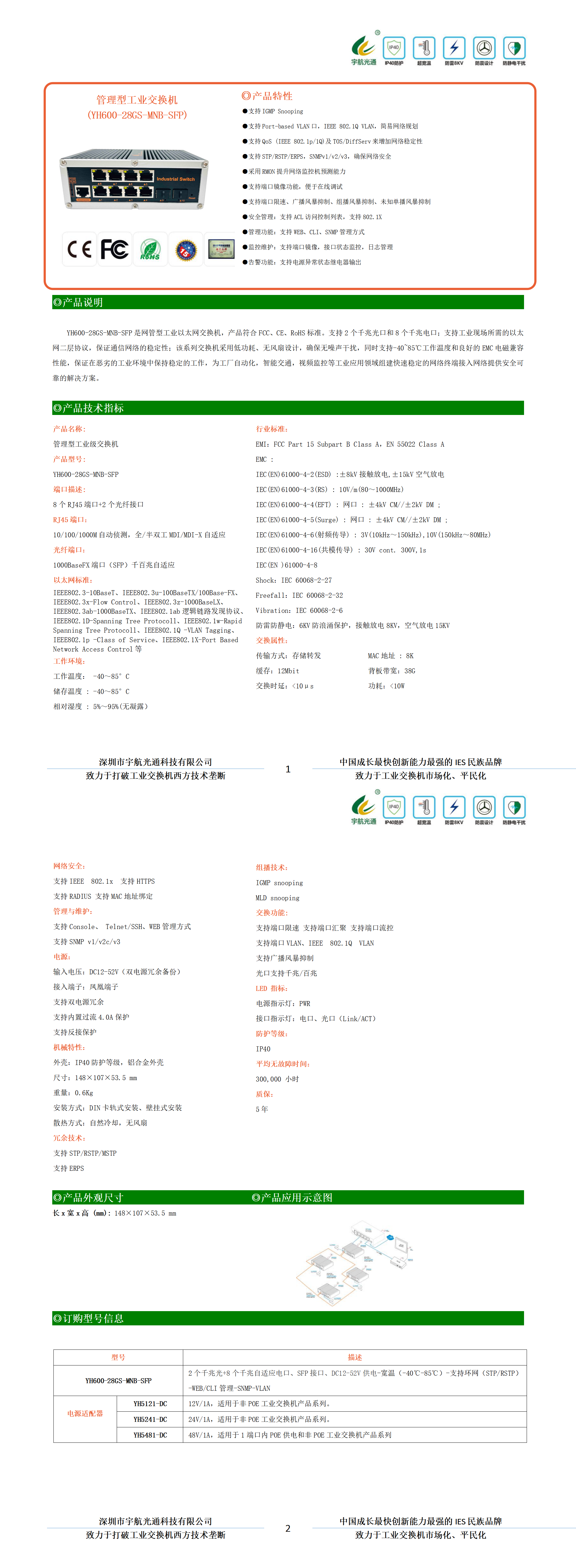 YH600-28GS-MNB-SFP是網(wǎng)管型工業(yè)以太網(wǎng)交換機(jī),產(chǎn)品符合FCC、CE、RoHS標(biāo)準(zhǔn)。支持2個(gè)千兆光口和8個(gè)千兆電口;支持工業(yè)現(xiàn)場(chǎng)所需的以太網(wǎng)二層協(xié)議,保證通信網(wǎng)絡(luò)的穩(wěn)定性;該系列交換機(jī)采用低功耗、無(wú)風(fēng)扇設(shè)計(jì),確保無(wú)噪聲干擾,同時(shí)支持-40~85℃工作溫度和良好的EMC電磁兼容性能,保證在惡劣的工業(yè)環(huán)境中保持穩(wěn)定的工作,為工廠自動(dòng)化,智能交通,視頻監(jiān)控等工業(yè)應(yīng)用領(lǐng)域組建快速穩(wěn)定的網(wǎng)絡(luò)終端接入網(wǎng)絡(luò)提供安全可靠的解決方案。