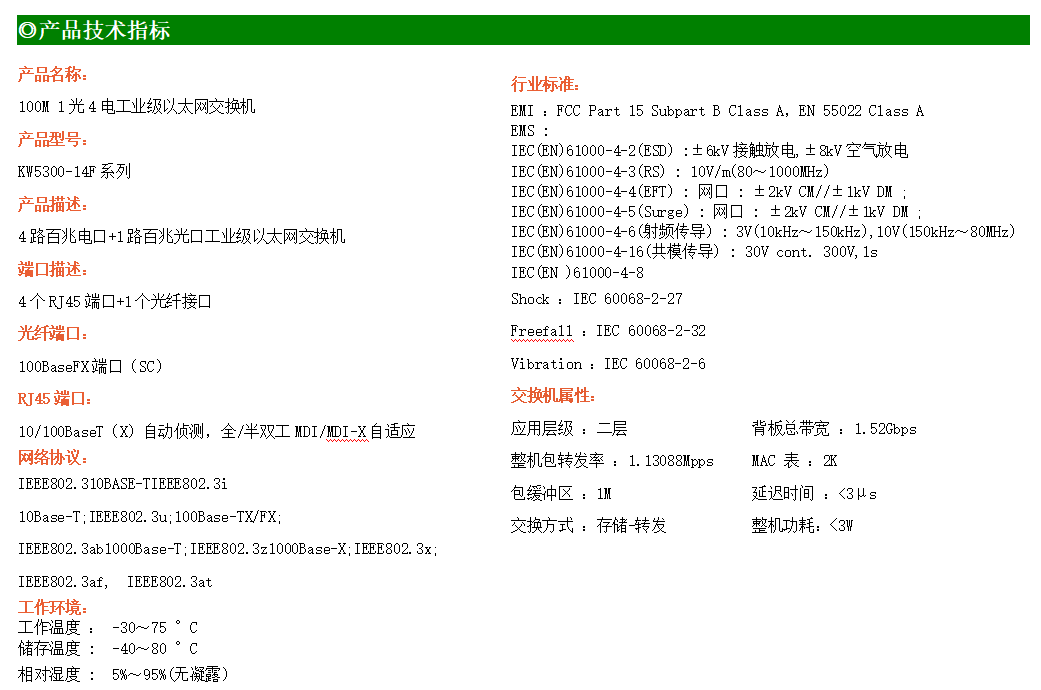 4路百兆電口+1路百兆FX光口工業級以太網交換機,支持4個10Base-T/100Base-TX電口和1個100Base-X光口。產品符合FCC、CE、ROHS標準。KW5300-14F系列交換機具有-30℃~75℃的工作溫度,具有超強的堅固度能適應各種嚴苛環境,也可以非常方便的安置在空間緊湊的控制箱中。導軌的安裝特性、寬溫操作及擁有IP40防護等級的外殼及LED指示燈,使AF14F成為一個即插即用的工業級設備,為用戶的以太網設備聯網提供可靠、便捷的解決方案。