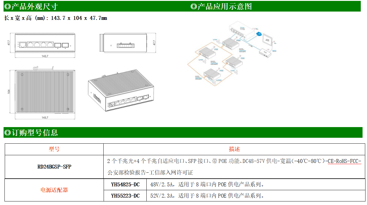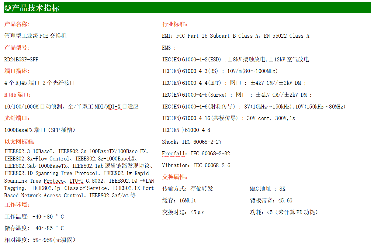RD24GSP-M-SFP是網管型工業以太網POE交換機,產品符合FCC、CE、RoHS標準。支持2個千兆光口和4個千兆電口;支持工業現場所需的以太網二層協議,保證通信網絡的穩定性;該系列交換機采用低功耗、無風扇設計,確保無噪聲干擾,同時支持-40~80℃工作溫度和良好的EMC電磁兼容性能,保證在惡劣的工業環境中保持穩定的工作,為工廠自動化,智能交通,視頻監控等工業應用領域組建快速穩定的網絡終端接入網絡提供安全可靠的解決方案。