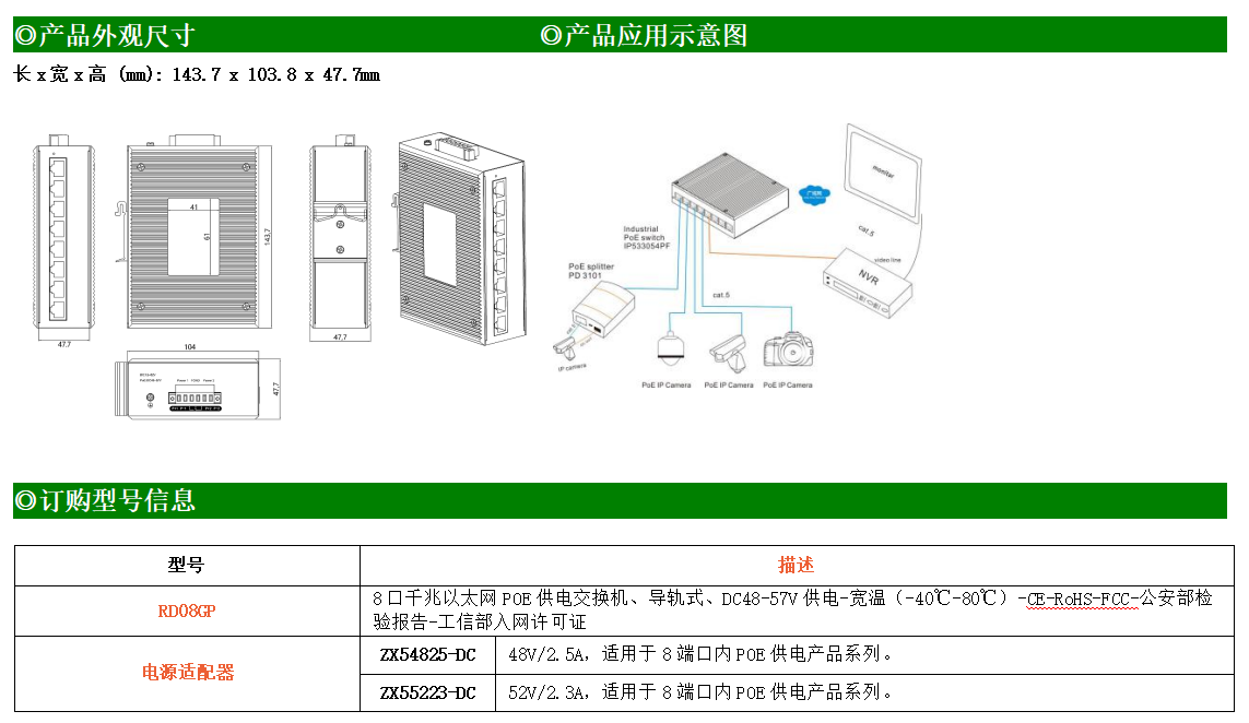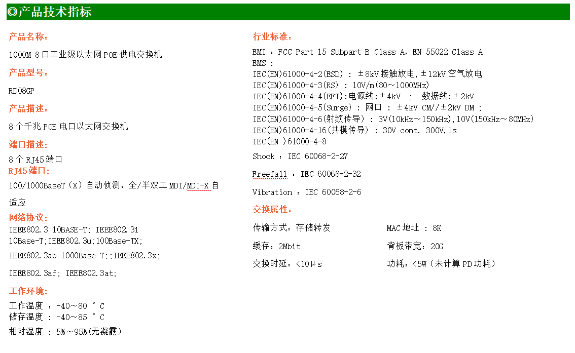 8路千兆電口工業(yè)級(jí)以太網(wǎng)POE交換機(jī),支持8個(gè)100Base-T/1000Base-TX POE電口。產(chǎn)品符合FCC、CE、ROHS標(biāo)準(zhǔn)。RD08GP交換機(jī)具有-40℃~80℃的工作溫度,具有超強(qiáng)的堅(jiān)固度能適應(yīng)各種嚴(yán)苛環(huán)境,也可以非常方便的安置在空間緊湊的控制箱中。導(dǎo)軌的安裝特性、寬溫操作及擁有IP40防護(hù)等級(jí)的外殼及LED指示燈,使RD08GP成為一個(gè)即插即用的工業(yè)級(jí)設(shè)備,為用戶的以太網(wǎng)設(shè)備聯(lián)網(wǎng)提供可靠、便捷的解決方案。