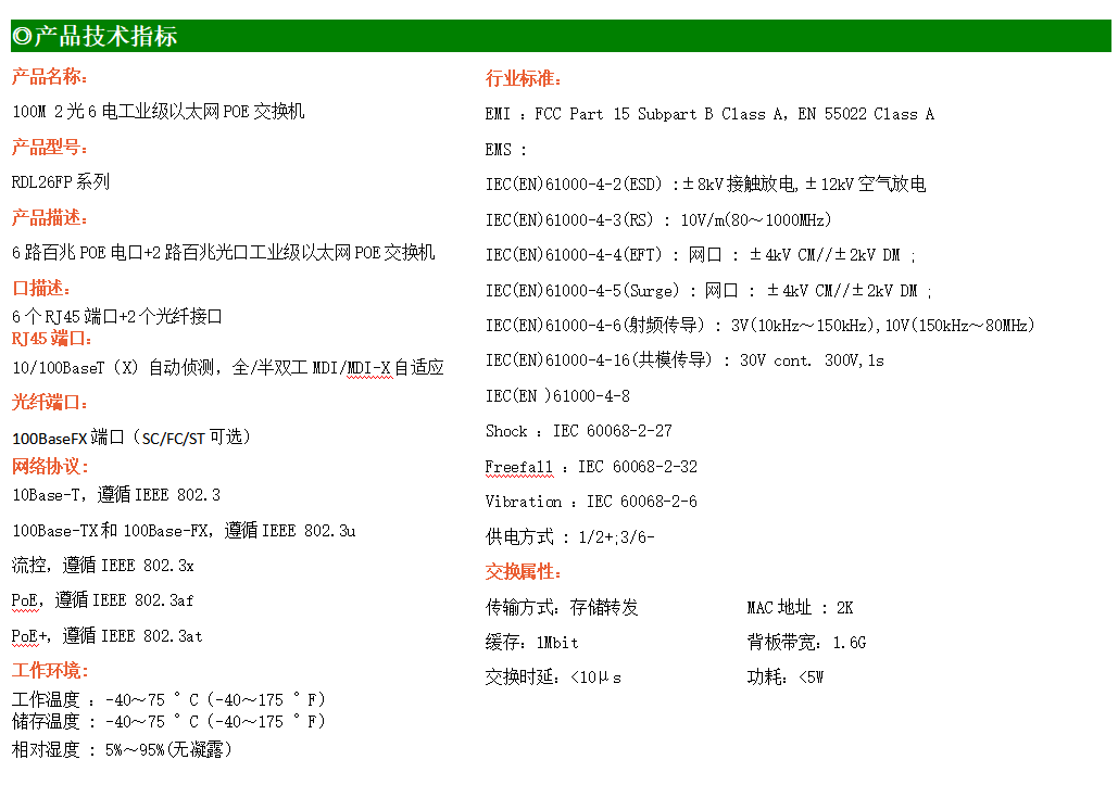 6路百兆POE電口+2路百兆FX光口工業(yè)級以太網(wǎng)交換機,支持6個10Base-T/100Base-TX電口和2個100Base-X光口。產(chǎn)品符合FCC、CE、ROHS標準。RDL26FP系列交換機具有-40℃~75℃的工作溫度,具有超強的堅固度能適應(yīng)各種嚴苛環(huán)境,也可以非常方便的安置在空間緊湊的控制箱中。導(dǎo)軌的安裝特性、寬溫操作及擁有IP40防護等級的外殼及LED指示燈,使RDL26FP成為一個即插即用的工業(yè)級設(shè)備,為用戶的以太網(wǎng)設(shè)備聯(lián)網(wǎng)提供可靠、便捷的解決方案。
