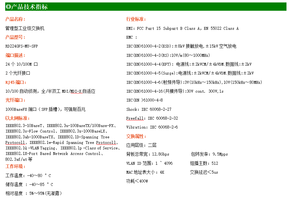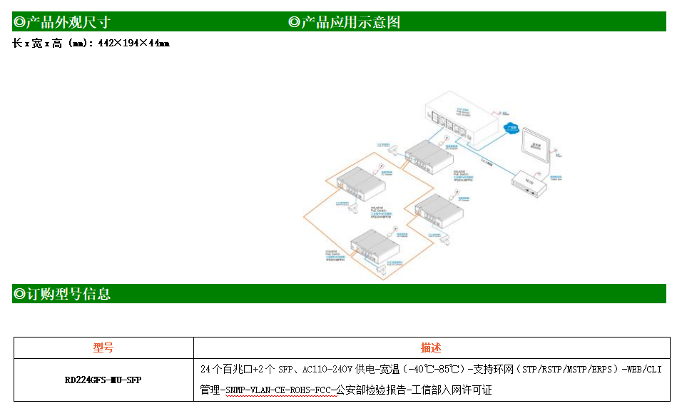 RD224GFSP-MU-AC-SFP是網(wǎng)管型工業(yè)以太網(wǎng)PoE交換機,產(chǎn)品符合FCC、CE、RoHS標(biāo)準(zhǔn)。可提供24個百兆PoE端口,所有PoE端口符合IEEE802.3af/at標(biāo)準(zhǔn)。支持工業(yè)現(xiàn)場所需的以太網(wǎng)二層協(xié)議,保證通信網(wǎng)絡(luò)的穩(wěn)定性;該系列交換機采用低功耗、無風(fēng)扇設(shè)計,確保無噪聲干擾,同時支持-40~85℃工作溫度和良好的EMC電磁兼容性能,保證在惡劣的工業(yè)環(huán)境中保持穩(wěn)定的工作,為工廠自動化,智能交通,視頻監(jiān)控等工業(yè)應(yīng)用領(lǐng)域組建快速穩(wěn)定的網(wǎng)絡(luò)終端接入網(wǎng)絡(luò)提供安全可靠的解決方案。