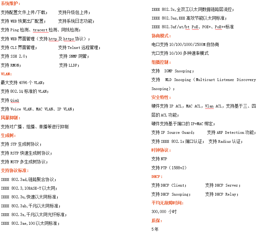 ●網絡冗余:支持STP/RSTP/MSTP,支持ERPS(自愈時間<20ms)