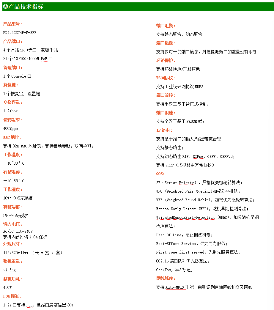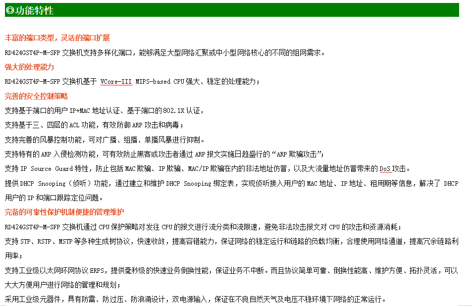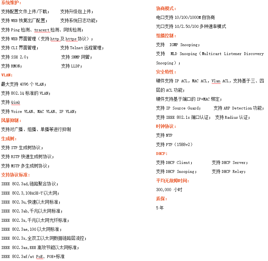 ●網(wǎng)絡(luò)冗余:支持STP/RSTP/MSTP,支持ERPS(自愈時間<20ms)