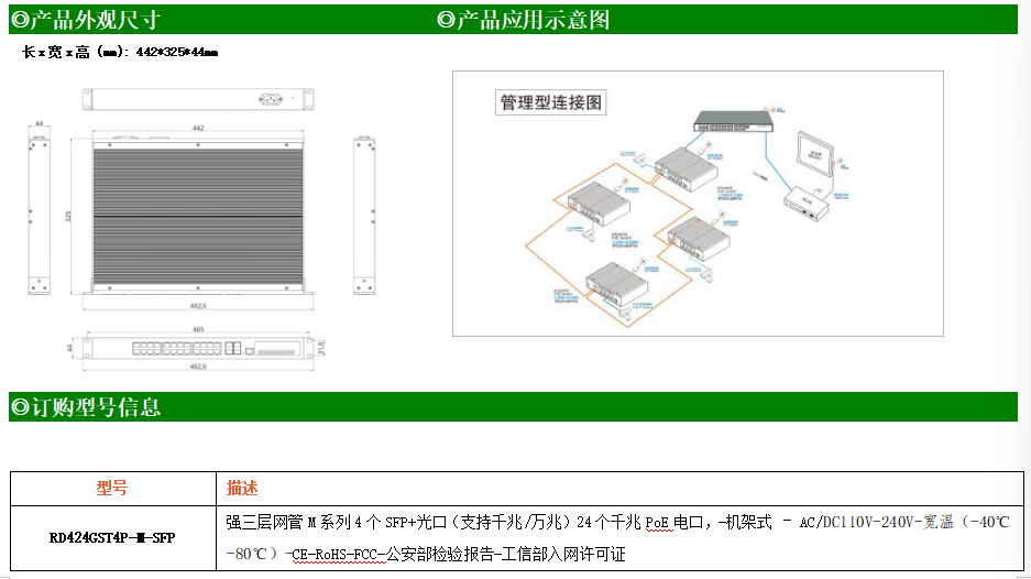 RD424GST4P-M-SFP交換機是我司推出的一款萬兆三層工業(yè)以太網(wǎng)交換機,產(chǎn)品符合FCC、CE、RoHS標準??商峁?4個千兆PoE端口,所有PoE端口符合IEEE802.3af/at標準。具備先進的硬件處理能力和最豐富的業(yè)務(wù)特性。支持IPv4/IPv6 硬件雙棧及線速轉(zhuǎn)發(fā),使客戶能夠從容應(yīng)對即將帶來的IPv6 時代其提供高容量的交換能力。RD424GST4P-M-SFP交換機具有-40℃~80℃的工作溫度,具有超強的堅固度能適應(yīng)各種嚴苛環(huán)境,使RD424GST4P-M-SFP的交換機成為一個即插即用的工業(yè)級設(shè)備,為用戶的以太網(wǎng)設(shè)備聯(lián)網(wǎng)提供可靠、便捷的解決方案。