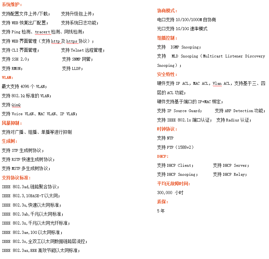 ●網絡冗余:支持STP/RSTP/MSTP,支持ERPS(自愈時間<20ms)