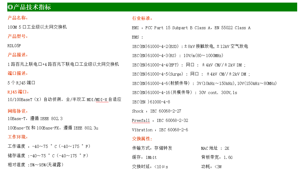 1路百兆上聯(lián)電口+4路百兆下聯(lián)電口工業(yè)級以太網(wǎng)交換機,支持1個10/100Base-TX上聯(lián)電口和4個10Base-T/100Base-TX下聯(lián)電口。產(chǎn)品符合FCC、CE、ROHS標準。RDL05F交換機具有-40℃~75℃的工作溫度,具有超強的堅固度能適應各種嚴苛環(huán)境,也可以非常方便的安置在空間緊湊的控制箱中。導軌的安裝特性、寬溫操作及擁有IP40防護等級的外殼及LED指示燈,使RDL05F成為一個即插即用的工業(yè)級設備,為用戶的以太網(wǎng)設備聯(lián)網(wǎng)提供可靠、便捷的解決方案。