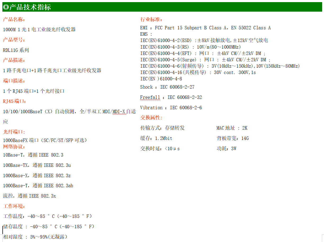 1路千兆電口+1路千兆FX光口工業(yè)級以太網(wǎng)交換機,支持1個10Base-T/100Base-T/1000Base-TX電口和1個1000Base-X光口。產(chǎn)品符合FCC、CE、ROHS標準。RDL11G系列交換機具有-40℃~75℃的工作溫度,具有超強的堅固度能適應各種嚴苛環(huán)境,也可以非常方便的安置在空間緊湊的控制箱中。導軌的安裝特性、寬溫操作及擁有IP40防護等級的外殼及LED指示燈,使RDL11G成為一個即插即用的工業(yè)級設備,為用戶的以太網(wǎng)設備聯(lián)網(wǎng)提供可靠、便捷的解決方案。