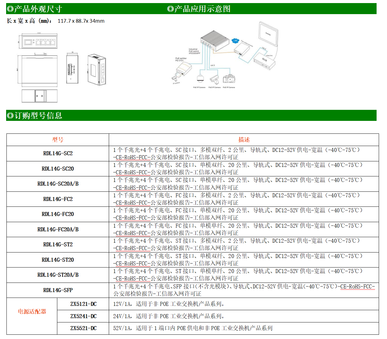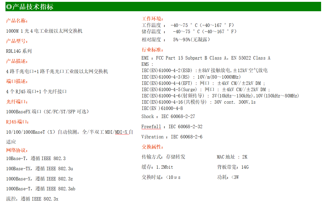 4路千兆電口+1路千兆FX光口工業(yè)級(jí)以太網(wǎng)交換機(jī),支持4個(gè)100Base-T/1000Base-TX電口和1個(gè)1000Base-X光口。產(chǎn)品符合FCC、CE、ROHS標(biāo)準(zhǔn)。RDL14G系列交換機(jī)具有-40℃~75℃的工作溫度,具有超強(qiáng)的堅(jiān)固度能適應(yīng)各種嚴(yán)苛環(huán)境,也可以非常方便的安置在空間緊湊的控制箱中。導(dǎo)軌的安裝特性、寬溫操作及擁有IP40防護(hù)等級(jí)的外殼及LED指示燈,使RDL14G系列成為一個(gè)即插即用的工業(yè)級(jí)設(shè)備,為用戶的以太網(wǎng)設(shè)備聯(lián)網(wǎng)提供可靠、便捷的解決方案。