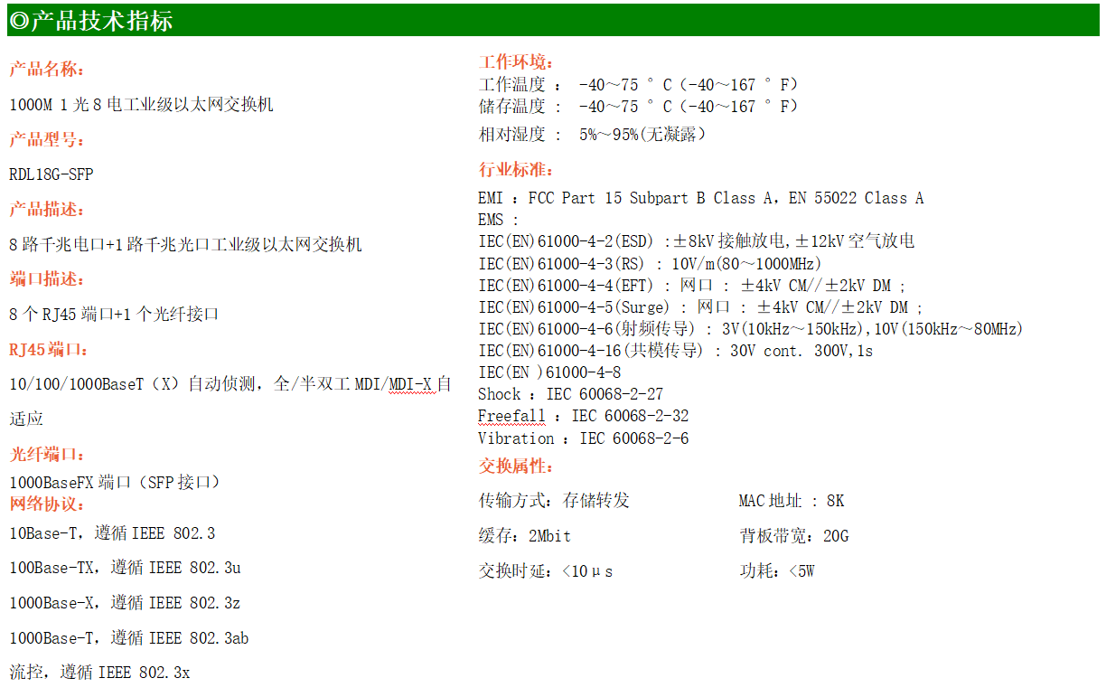 8路千兆電口+1路千兆FX光口工業級以太網交換機,支持8個100Base-T/1000Base-TX電口和1個1000Base-X光口。產品符合FCC、CE、ROHS標準。RDL18G系列交換機具有-40℃~75℃的工作溫度,具有超強的堅固度能適應各種嚴苛環境,也可以非常方便的安置在空間緊湊的控制箱中。導軌的安裝特性、寬溫操作及擁有IP40防護等級的外殼及LED指示燈,使RDL18G系列成為一個即插即用的工業級設備,為用戶的以太網設備聯網提供可靠、便捷的解決方案。
