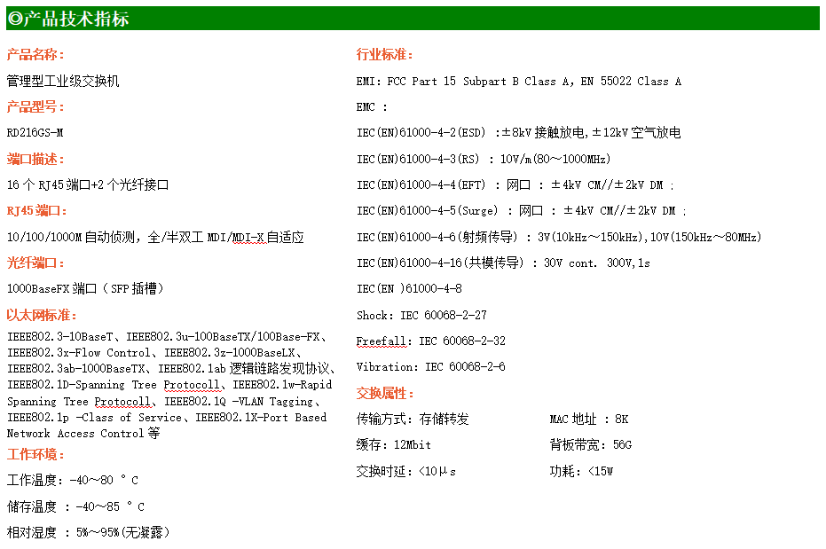 RD216GS-M是網管型工業以太網交換機,產品符合FCC、CE、RoHS標準。支持2個千兆光口和16個千兆電口;支持工業現場所需的以太網二層協議,保證通信網絡的穩定性;該系列交換機采用低功耗、無風扇設計,確保無噪聲干擾,同時支持-40~80℃工作溫度和良好的EMC電磁兼容性能,保證在惡劣的工業環境中保持穩定的工作,為工廠自動化,智能交通,視頻監控等工業應用領域組建快速穩定的網絡終端接入網絡提供安全可靠的解決方案。