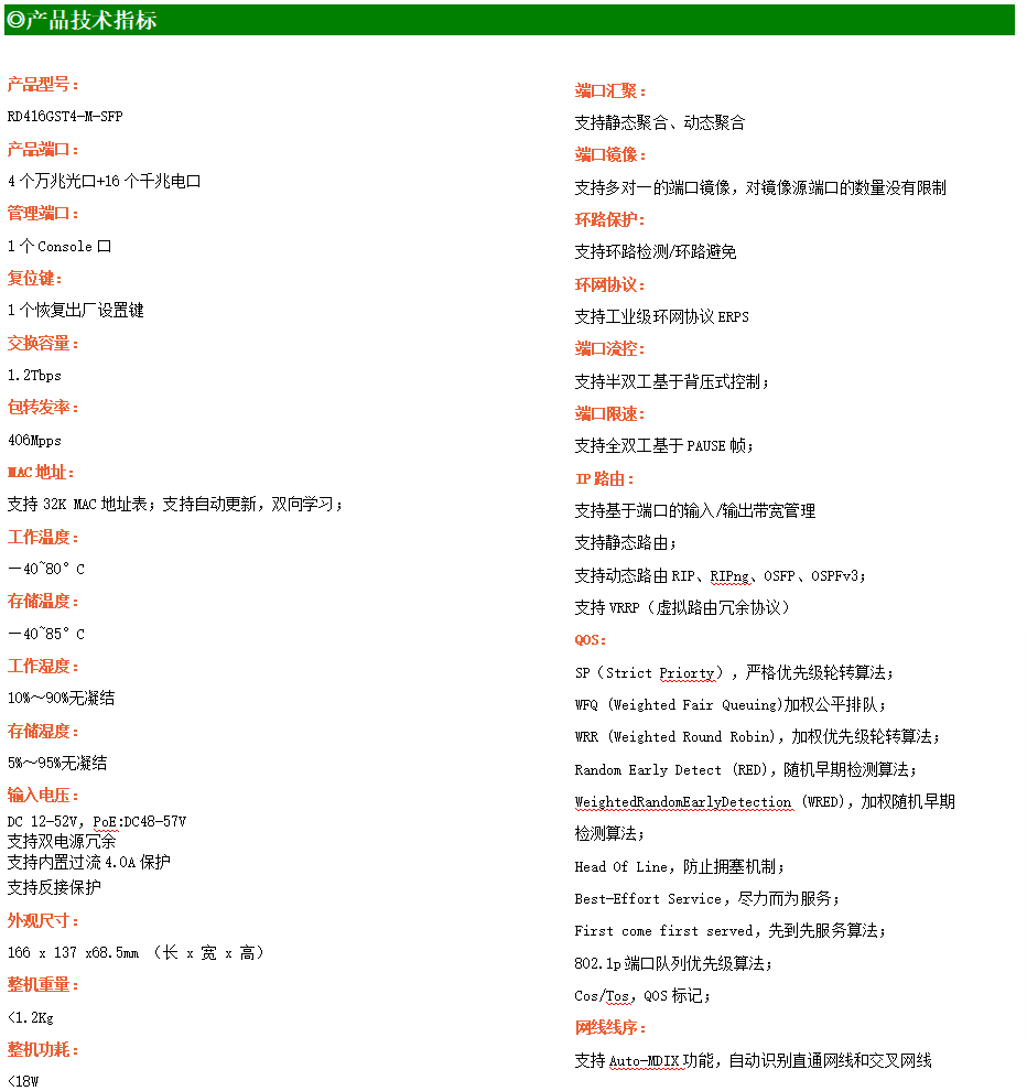 ●網(wǎng)絡(luò)冗余:支持STP/RSTP/MSTP,支持ERPS(自愈時(shí)間<20ms)