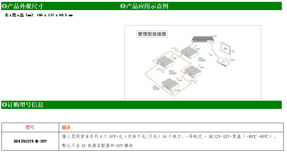 RD416GST4-M-SFP交換機(jī)是我司推出的一款萬兆三層交換機(jī),配備4個(gè)萬兆SFP+光口和16個(gè)10/100/1000M Base-T自適應(yīng)電口,具備先進(jìn)的硬件處理能力和最豐富的業(yè)務(wù)特性。支持IPv4/IPv6 硬件雙棧及線速轉(zhuǎn)發(fā),使客戶能夠從容應(yīng)對(duì)即將帶來的IPv6 時(shí)代其提供高容量的交換能力。RD416GST4-M-SFP交換機(jī)具有-40℃~80℃的工作溫度,具有超強(qiáng)的堅(jiān)固度能適應(yīng)各種嚴(yán)苛環(huán)境。導(dǎo)軌式安裝特性、寬溫操作,使RD416GST4-M-SFP的交換機(jī)成為一個(gè)即插即用的工業(yè)級(jí)設(shè)備,為用戶的以太網(wǎng)設(shè)備聯(lián)網(wǎng)提供可靠、便捷的解決方案。