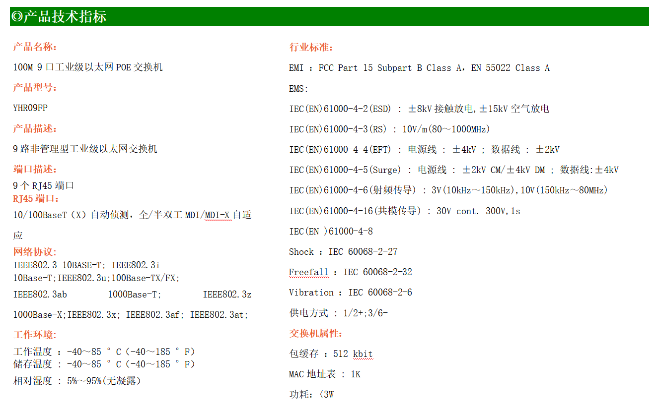 9路百兆電口工業級以太網交換機,支持9個10Base-T/100Base-TX電口。產品符合FCC、CE、ROHS標準。YH200-09FP交換機具有-40℃~85℃的工作溫度,具有超強的堅固度能適應各種嚴苛環境,也可以非常方便的安置在空間緊湊的控制箱中。導軌的安裝特性、寬溫操作及擁有IP40防護等級的外殼及LED指示燈,使YHR09FP成為一個即插即用的工業級設備,為用戶的以太網設備聯網提供可靠、便捷的解決方案。