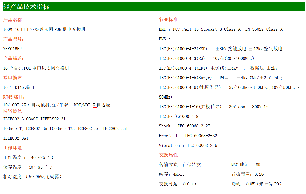 16路百兆電口工業級以太網交換機,支持16個10Base-T/100Base-TX POE電口。產品符合FCC、CE、ROHS標準。YHR016FP交換機具有-40℃~85℃的工作溫度,具有超強的堅固度能適應各種嚴苛環境,也可以非常方便的安置在空間緊湊的控制箱中。導軌的安裝特性、寬溫操作及擁有IP40防護等級的外殼及LED指示燈,使YH200-016FP成為一個即插即用的工業級設備,為用戶的以太網設備聯網提供可靠、便捷的解決方案。