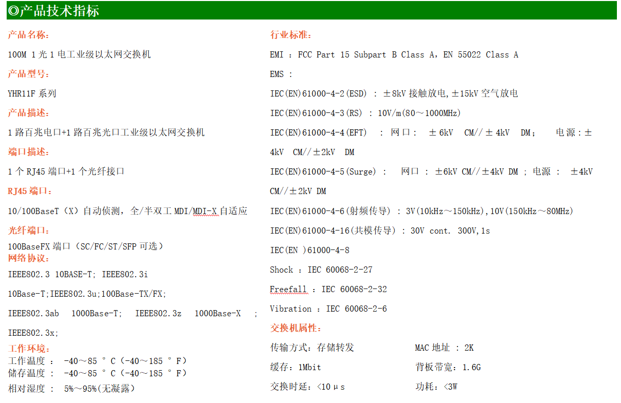 1路百兆電口+1路百兆FX光口工業級以太網交換機,支持1個10Base-T/100Base-TX電口和1個100Base-X光口。產品符合FCC、CE、ROHS標準。YH200-11F系列交換機具有-40℃~85℃的工作溫度,具有超強的堅固度能適應各種嚴苛環境,也可以非常方便的安置在空間緊湊的控制箱中。導軌的安裝特性、寬溫操作及擁有IP40防護等級的外殼及LED指示燈,使YH200-11F成為一個即插即用的工業級設備,為用戶的以太網設備聯網提供可靠、便捷的解決方案。