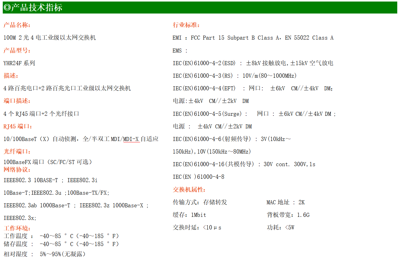 4路百兆電口+2路百兆FX光口工業(yè)級以太網(wǎng)交換機,支持4個10Base-T/100Base-TX電口和2個100Base-X光口。產(chǎn)品符合FCC、CE、ROHS標準。YH200-24F系列交換機具有-40℃~85℃的工作溫度,具有超強的堅固度能適應(yīng)各種嚴苛環(huán)境,也可以非常方便的安置在空間緊湊的控制箱中。導(dǎo)軌的安裝特性、寬溫操作及擁有IP40防護等級的外殼及LED指示燈,使YH200-24F成為一個即插即用的工業(yè)級設(shè)備,為用戶的以太網(wǎng)設(shè)備聯(lián)網(wǎng)提供可靠、便捷的解決方案。