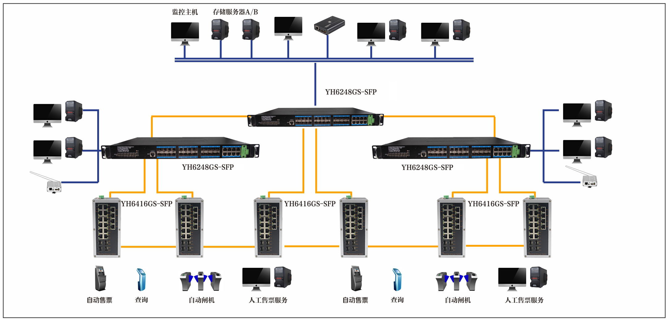 宇航在軌道交通自動售票檢票系統解決方案中采用了YH6248G4TS-SFP,YH6416GS-SFP工業交換機設備組網。車站終端系統:車站終端系統設備與YH6416GS-SFP系列網管型工業以太網交換機分別相連,再與核心交換機組成冗余環網。